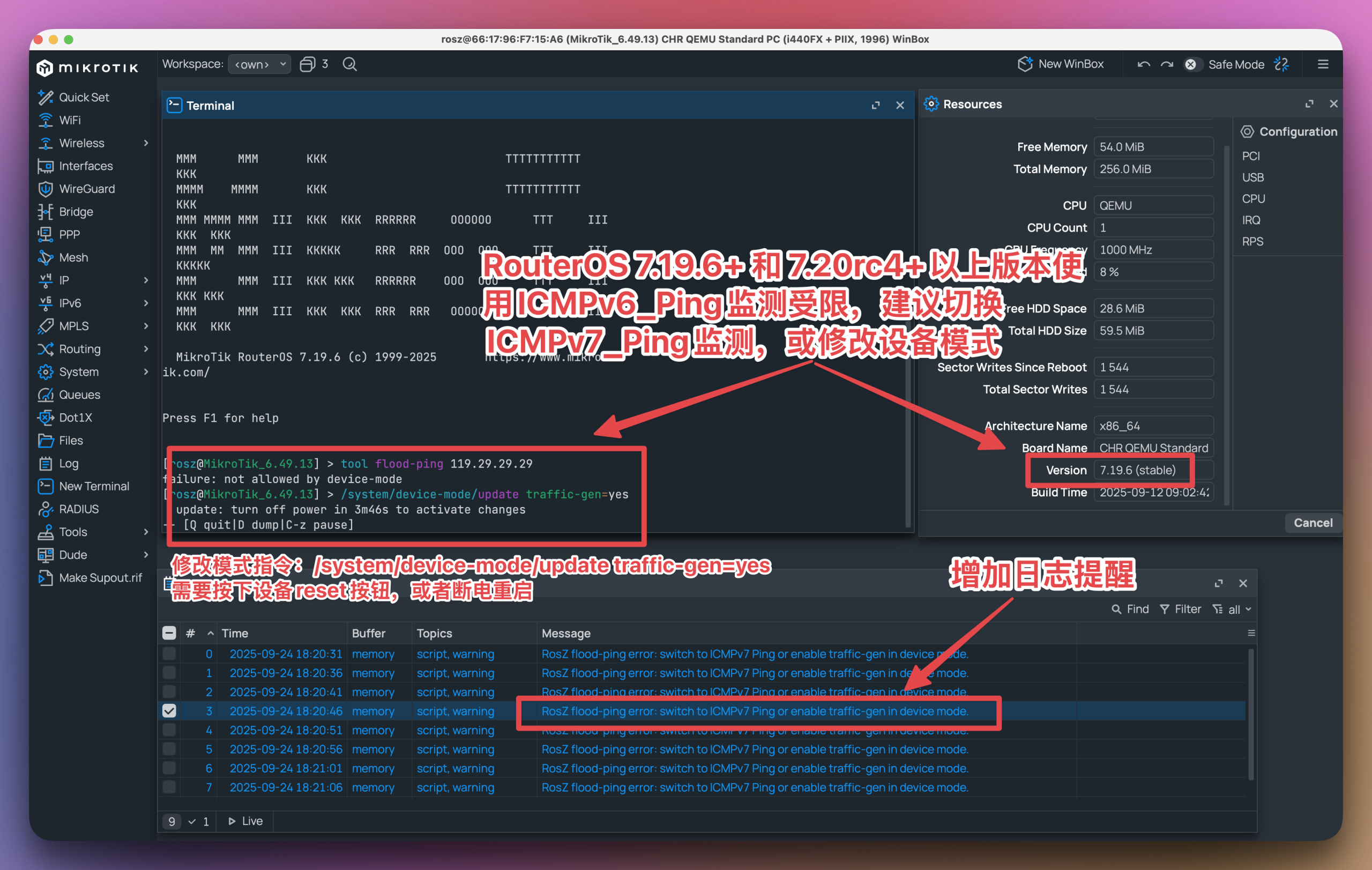 RouterOS更新到7.19.6和7.20rc4后,device-mode为advanced时,默认禁用traffic-gen功能,导致traffic flood-ping指令无法正常执行,影响RosZ的ICMPv6_Ping监测功能。